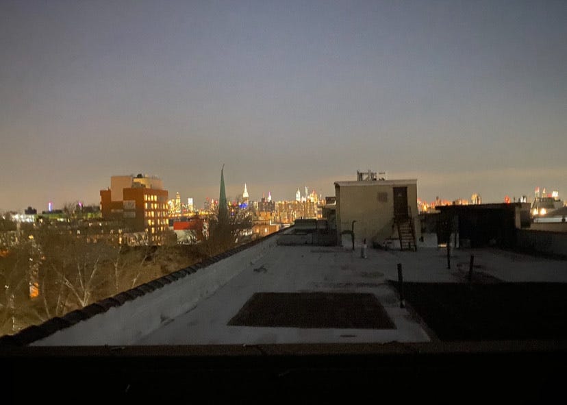 I am high and drunk upon entering the building with a revolving door, concierge, and tall ceilings. The marble ceiling makes me think of the inside of the Winters’ barn that stands beyond the cornfield of my childhood home. Every tall ceiling in New York makes me think of the barn. Within the cracks you could see stars at night. You can’t see stars here. I’m so drunk I am seeing stars.